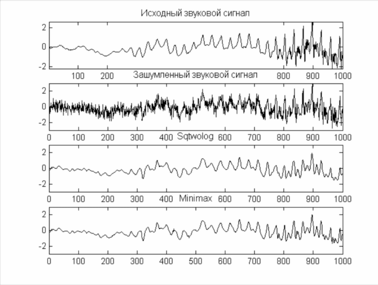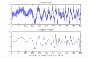 Ниже дан листинг загрузки сигнала, его очистка от шума с компрессией и построение исходного и очищенного сигналов (рис. 2.20 ):