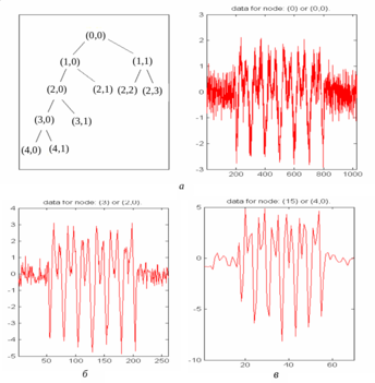 Наилучшее дерево показало на рис. 2.21, а слева; оно действительно короче полного дерева. Справа представлен исходный сигнал – временная зависимость в узле (0,0). Для получения временной зависимости в нужном узле надо установить на него мышь и щелкнуть её левой клавишей. Рекомендуется просмотреть диаграммы сначала в первых узлах (1,0) и (1,1) дерева, чтобы «почувствовать» разделение сигнала на низкочастотную и высокочастотную составляющие. Затем, перемещаясь по дереву вниз, можно наблюдать форму отфильтрованного НЧ-сигнала (левые ветви) и подавляемой ВЧ составляющей. На рис. 2.21, б, в даны временные диаграммы в узлах (2,0) и (4,0), т.е. в левых ветвях дерева. Это декомпозиция (аппроксимация) сигнала второго и четвертого уровней. Очевидна очистка аппроксимированного сигнала и его сжатие (соответственно в 4 и 16 раз).