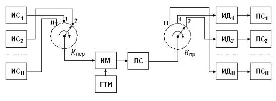 Пример 26. В системах связи для более полного использования каналов связи применяют принцип уплотнения. Временное уплотнение (временное разделение каналов) основано на применении теоремы отсчетов. На рис. 32 представлена упрощенная структурная схема многоканальной системы связи с временным разделением каналов. Источники сигналов ИС соединены с коммутатором передатчика Кпер. Коммутатор поочерёдно подключает источники к модулятору ИМ, который модулирует сигнал-переносчик. После прохождения по линии связи ЛС переносчик разделяется коммутатором приёмника Кпр на канальные сигналы, которые после демодуляции в демодуляторах ИД поступают к получателям сигналов ПС. Следует отметить, что в системах связи с ВРК необходима синхронизация приемной и передающей станций. ◄