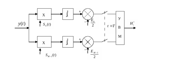 Первое слагаемое в выражении называется корреляционным интегралом, так как совпадает по форме с выражением взаимно-корреляционной функции сигнала и наблюдаемого процесса при нулевом сдвиге. Устройство выбора максимума УВМ вырабатывает на выходе номер канала, в котором величина максимальна. Приёмник упрощается, когда энергии всех сигналов равны.