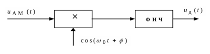 Очевидно, первое слагаемое не представляет интереса и должно быть подавлено фильтром нижних частот. Второе слагаемое представляет собой полезный сигнал, при этом, очевидно, полезный эффект будет максимальным, если опорное колебание будет иметь не только ту же частоту, что и несущее колебание АМ-сигнала, но и ту же начальную фазу, то есть должно выполняться условие