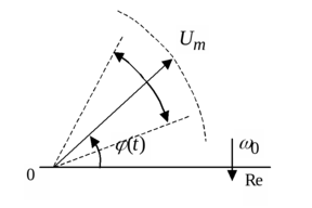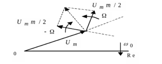На Рис. 45 показана векторная диаграмма УМ-колебания. Вектор, изображающий колебание, не изменяет своей длины, но с течением времени он изменяет свое положение между двумя штриховыми линиями, отстоящими от среднего положения на величину индекса модуляции, при этом конец вектора перемещается по окружности.