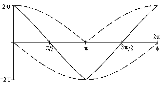 . Зависимость выходного напряжения от угла показана сплошной линией на Рис. 52 (амплитуды опорного и модулированного напряжения приняты равными друг другу). Штриховые линии соответствуют выражениям – . Видно, что детекторная характеристика практически линейна при изменении угла от 0 до 180°.