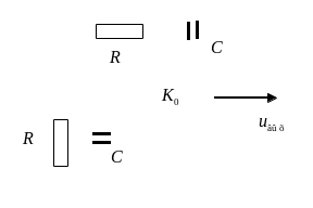 -генератора колебаний с мостом Вина. Считая входное сопротивление усилителя (обозначенного треугольником) бесконечно большим, найдите коэффициент обратной связи. Определите значение коэффициента усиления
