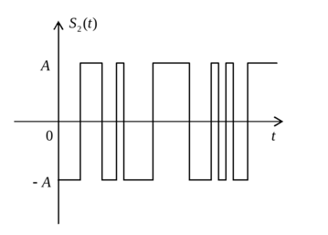Изобразите примерный вид плотности распределения вероятности случайного процесса, реализации которого имеют вид прямоугольных колебаний с постоянной амплитудой и случайной сменой полярности, Рис. 8