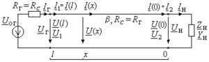 В заключение для контроля верности расчетов следует сравнить между собой значения сопротивления Z(l) (проводимости Y(l)) в начале отрезка линии и сопротивления Zн (проводимости Yн) пассивной нагрузки с составляющими соответствующих величин в начале (x = l) и в конце отрезка линии (x = 0).