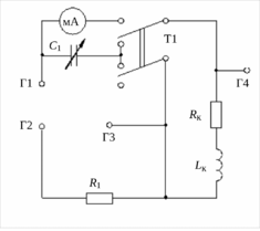 1. Собрать на стенде параллельный колебательный контур, для чего тумблер Т1 установить в верхнее положение и включить согласно схеме миллиамперметр (рис. 9.1). Подключить генератор к входным зажимам контура – гнезда Г1–Г2, причем нулевой зажим генератора подключить к гнезду Г2. Для удобства измерений рекомендуется воспользоваться универсальной панелью.