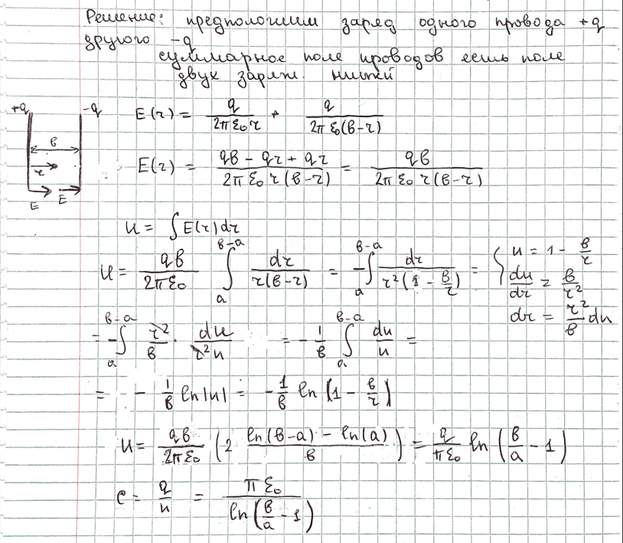 Два длинных прямых провода одинакового сечения a расположены в воздухе параллельно друг другу. Расстояние между их осями равно b. Найти взаимную ёмкость проводов на единицу их длины, если a<<b.