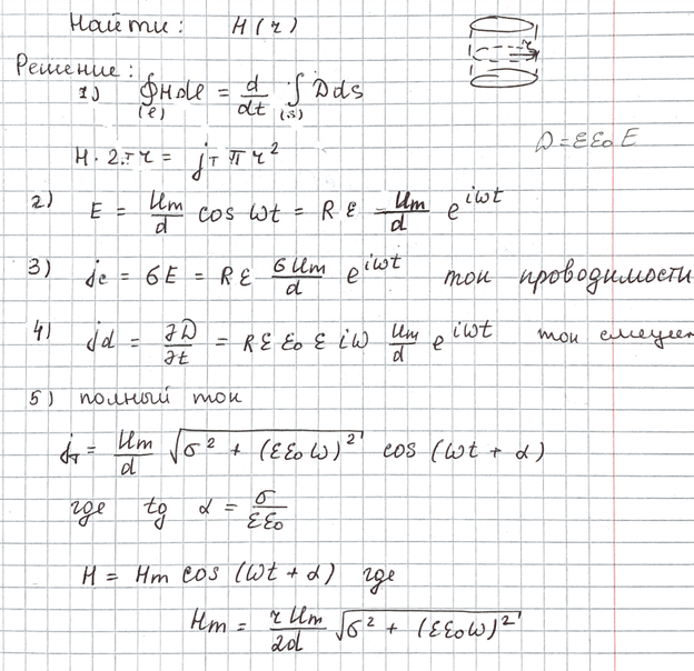 Пространство между обкладками плоского конденсатора, имеющими форму круглых дисков, заполнено однородной слабо проводящей средой с удельной проводимостью и диэлектрической проницаемостью . Расстояние между обкладками d. Пренебрегая краевыми эффектами, найти напряженность магнитного поля между обкладками на расстоянии r от их оси, если на конденсатор подано переменное напряжение