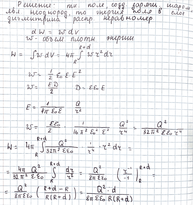 Металлический шар радиусом R=15 см несёт заряд Q=20 нКл. Шар окружён слоем парафина ( = 2) толщиной d=5 см. Определить энергию W электрического поля, заключенную в слое диэлектрика.