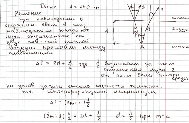 Какой должна быть минимальная толщина воздушного слоя между двумя плоскими стеклянными пластинами, чтобы стекло при нормальном падении света с длиной волны =640 нм казалось темным (и светлым)? Наблюдение ведется в отраженном свете.