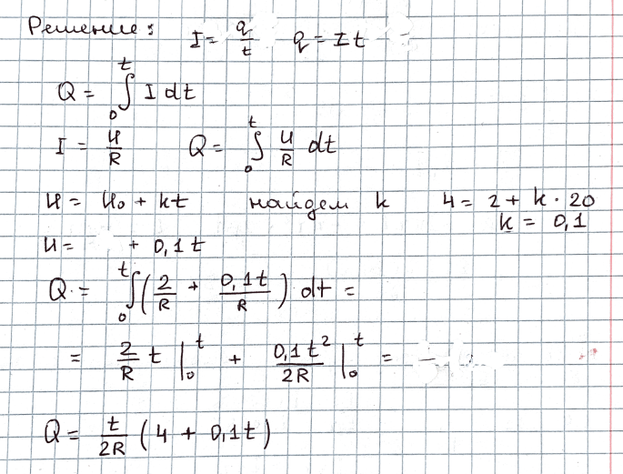 Сила тока в проводнике сопротивлением R=20 Ом нарастает в течение времени t=2 с по линейному закону от