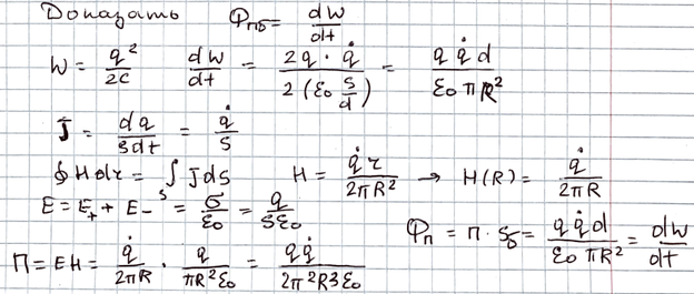 Плоский воздушный конденсатор с круглыми пластинами радиуса R медленно заряжают постоянным током. Показать, что поток вектора Пойнтинга через боковую поверхность конденсатора равно скорости приращения энергии W конденсатора.