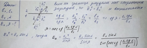 и нормалью к поверхности раздела диэлектриков равен . Найти величину и направление электрического поля внутри диэлектрика с проницаемостью