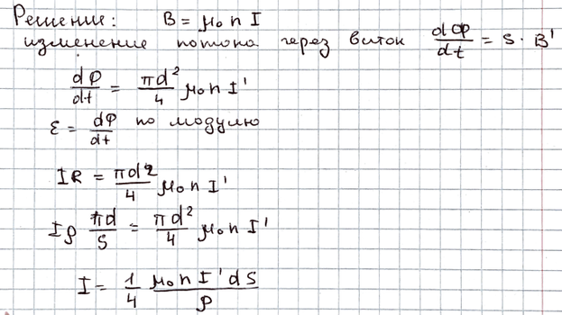 На длинный соленоид, имеющий диаметр сечения d=5 см и содержащий n=20 витков на 1 см длины, плотно надет круговой виток из медного провода сечением S=1,0 мм2. Найти ток в витке, если ток в обмотке соленоида увеличивают с постоянной скоростью