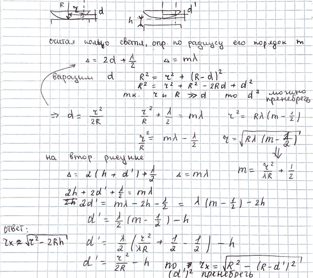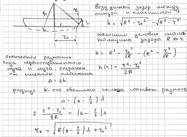 =3.0 мм, которым она соприкасается со стеклянной пластинкой. Радиус кривизны выпуклой поверхности линзы R=150 см. Найти радиус шестого светлого кольца в отраженном свете с =655 нм.