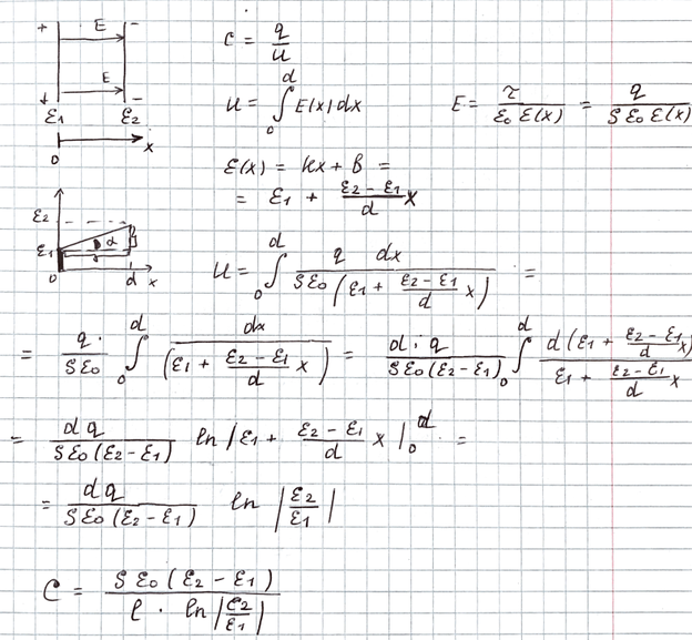Зазор между обкладками плоского конденсатора заполнен диэлектриком, проницаемость которого линейно растёт в перпендикулярном обкладкам направлении от