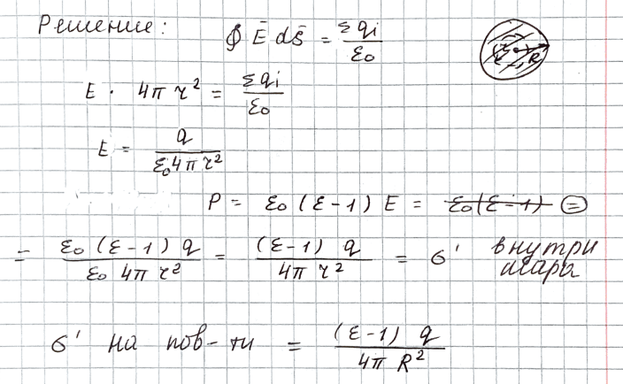 В центре шара из однородного диэлектрика с проницаемостью =2,5 и радиусом R=10 см находится сторонний заряд q=50 мкКл. Найти плотность связанных зарядов на поверхности и внутри шара.