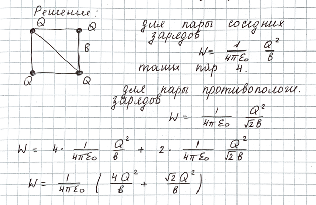 Четыре равных точечных заряда Q расположены в вершинах квадрата со стороной b. а) Чему равна электрическая энергия системы? б) Какую потенциальную энергию будет иметь, пятый заряд Q, помещенный в центре квадрата (относительно