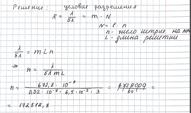 Свет падает нормально на дифракционную решетку шириной L=6,5 см. Исследуемый: спектр содержит спектральную линию с =672.8 нм, которая состоит из двух компонент, отличающихся на =0.02 нм. Эти линии разрешены в спектре третьего порядка. Найти число штрихов на 1 мм.