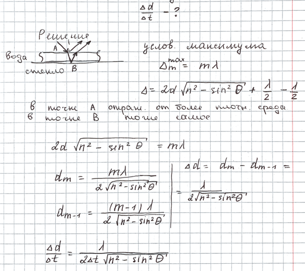 На поверхности стекла находится пленка воды. На неё подаст свет с =0,68 мкм под углом =30° к нормали. Найти скорость, с которой уменьшается толщина пленки из-за испарения, если промежуток времени между последовательными максимумами отражения ∆t=15 мин. Показатель преломления воды n=1.33.