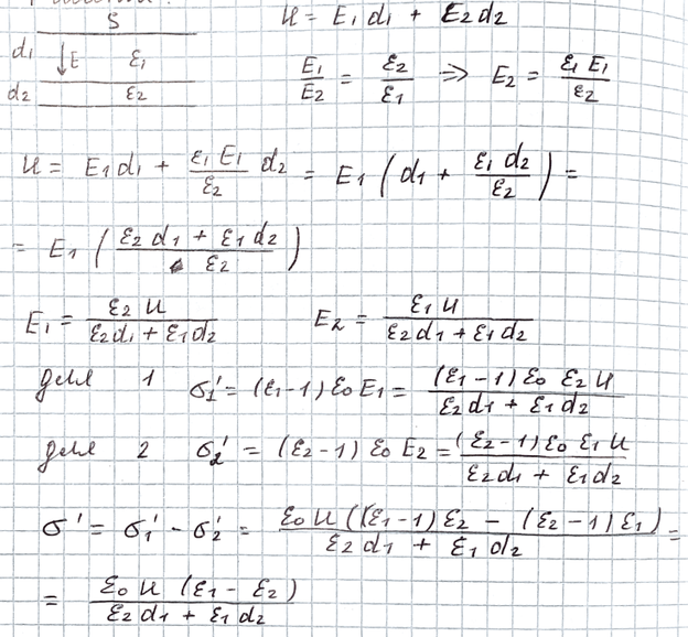 . Площадь каждой обкладки равна S. Найти плотность * связанных зарядов на границе раздела слоев, если напряжение на конденсаторе равно U и электрическое поле направлено от слоя 1 к слою 2.