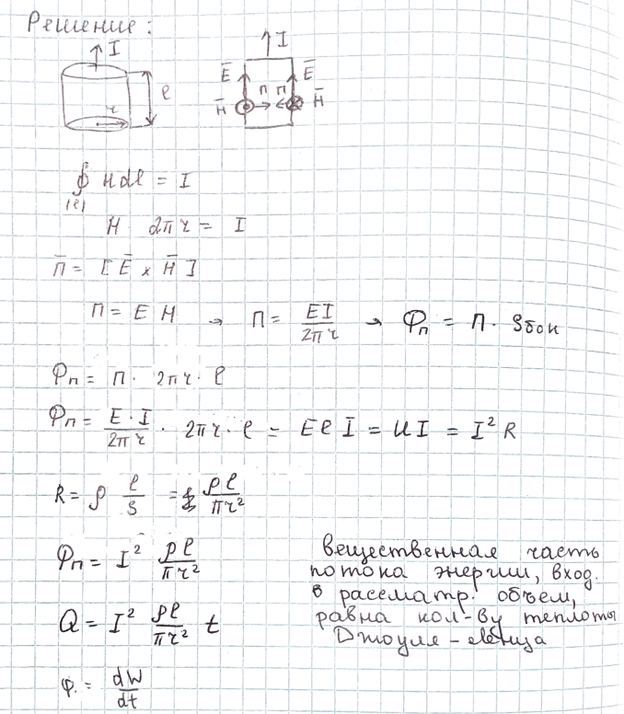 По проводнику круглого сечения радиуса r и удельным сопротивлением р течет ток I. Вычислить поток вектора Пойнтинга за время t через боковую поверхность проводника длиной l и сравнить полученную величину с энергией Джоуля-Ленца, выделившейся за это время в объёме проводника той же длины.