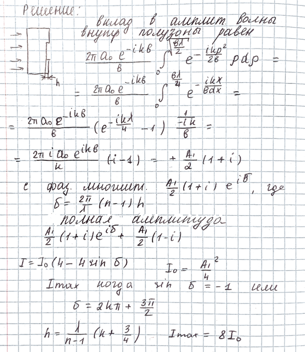 и падает нормально на большую стеклянную пластинку, противоположная сторона которой представляет собой непрозрачный экран с круглым отверстием радиусом равным первой зоне Френеля для точки наблюдения P. В середине отверстия сделана круглая выемка радиусом равным половине зоны Френеля. При какой глубине этой выемки интенсивность света в точке P будет минимальной?