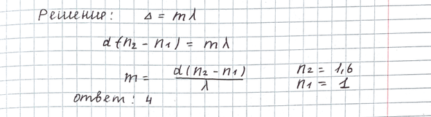 На экране наблюдается интерференционная картина в результате наложения лучей от двух когерентных источников ( = 600 нм). Определите, на сколько полос сместится интерференционная картина, если на пути одного из лучей перпендикулярно ему поместить стеклянную пластинку (n=1,6) толщиной d=4мкм.