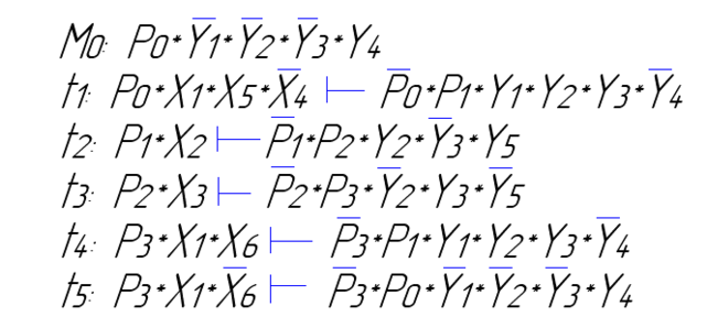 Мы составляем аналитическую форму графа операций в виде системы конъюктивных секвенций, упрощающую переход от первичного графического описания к управляющей программе. При этом в левой части секвенционных операторов содержится конъюкция, состоящая из логических переменных, кодирующих позиции, из которых ведет данный переход и логических переменных, взвешивающих данный переход. В правой части содержится конъюкция, состоящая из логических переменных, кодирующая позиции, в которые ведет данный переход и логических переменных, взвешивающих эти позиции.
