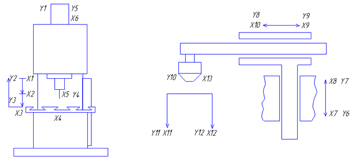 | Y13 | сигнал на соседний агрегат и на индикацию оператору – станок находится в исходном состоянии (инструмент сверху) | Z1D |