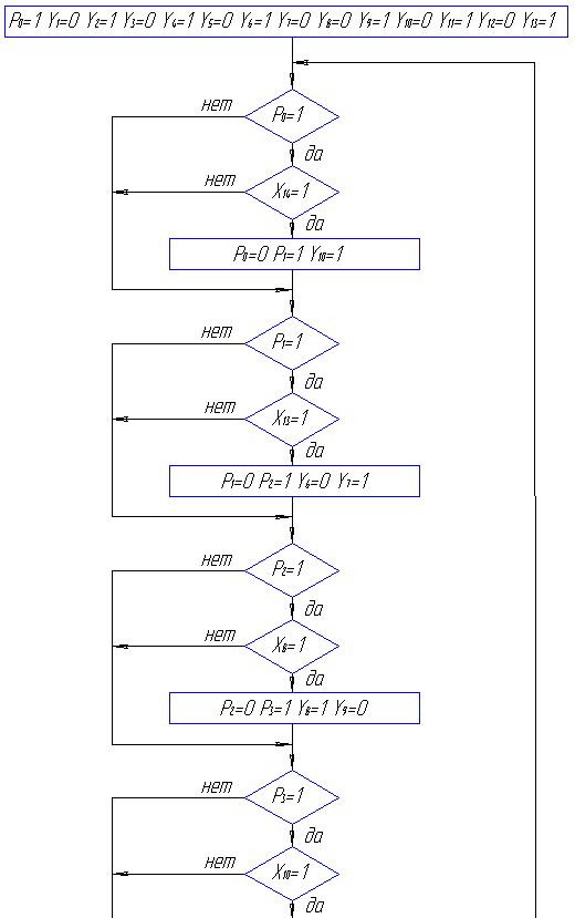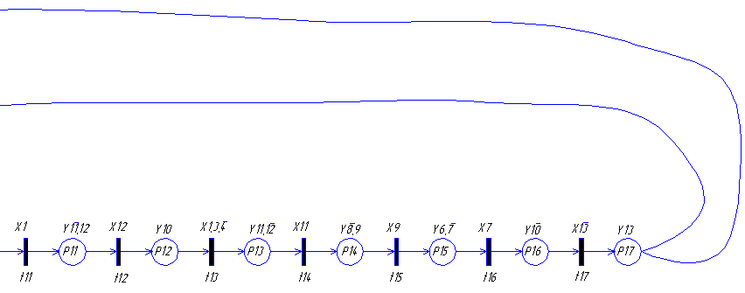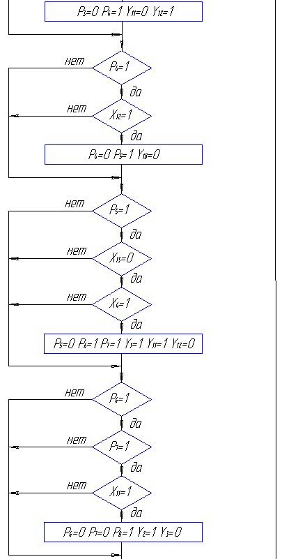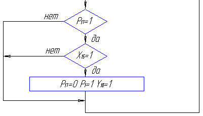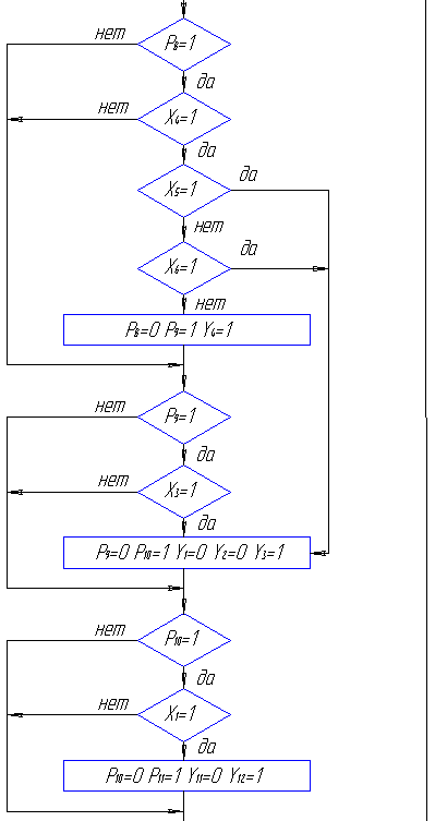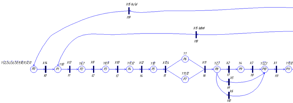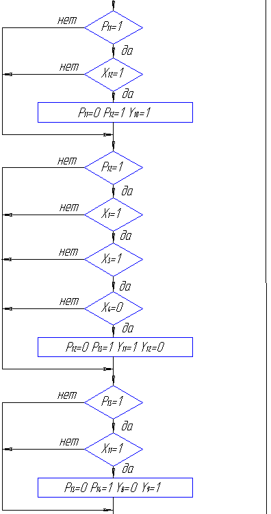 Позиции графа помечены функциями (конъюнкциями) сигналов на исполнительные механизмы и органы индикации объекта управления, а переходы функциями (конъюнкциями) сигналов от датчиков и органов управления.