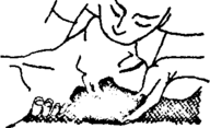 По окончании подготовительных операций зажмите ноздри пост-радавшего щекой или пальцами, сделаете 2-3 глубоких вдоха. Глубоко вдохните и, охватив губами его рот, сделайте с силой вдувание (рис.3, 4). Если открыть рот пострадавшему не удалось, можно проводить дыхание "изо рта в нос", т.е. вдувать ему воздух через нос, закрывая рот пострадавшего.