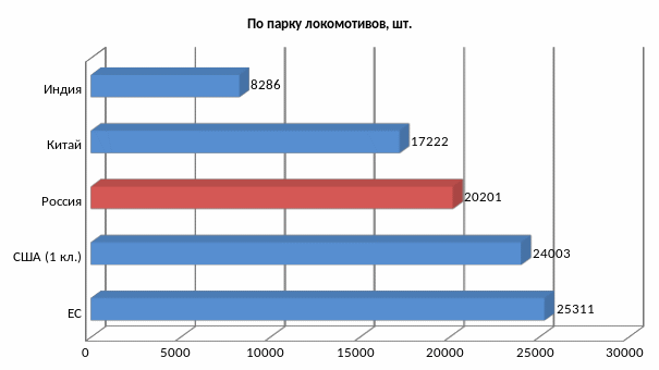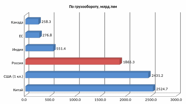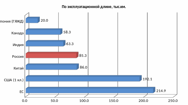 Российская железнодорожная сеть занимает по эксплуатационной длине третье место в мире и первое место по протяженности электрифицированных линий (50,3% от общей протяженности сети железных дорог или 43,1 тыс. км), третье – по грузообороту и объемам грузовых перевозок, пятое – по пассажирообороту. При этом грузонапряженность российских железных дорог самая высокая из рассматриваемых стран.