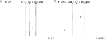 1 – Напряженность и напряжение в точке M на высоте 7 м; 2 – Напряженность и напряжение в точке M на высоте 1,8 м.