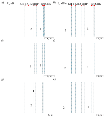 (справа). а,б – пятый провод отключен; в,г – шестой провод отключен, д,е – седьмой провод отключен. 1 – Напряженность и напряжение в точке M на высоте 7 м; 2 – Напряженность и напряжение в точке M на высоте 1,8 м.