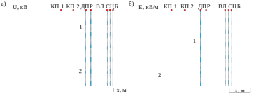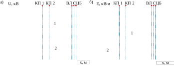 1 – Напряженность и напряжение в точке M на высоте 7 м; 2 – Напряженность и напряжение в точке M на высоте 1,8 м.