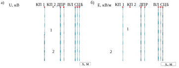 | Расстояние x, м | Напряженность Ey, кВ/м | Напряжение U, кВ | ||