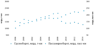Как следует из рисунка 1.1 с 1998 по 2014 год наблюдается устойчивый рост грузооборота, за исключением небольшого спада в 2009 году. Пассажирооборот в период 2008-2014 гг имеет тенденцию к уменьшению.