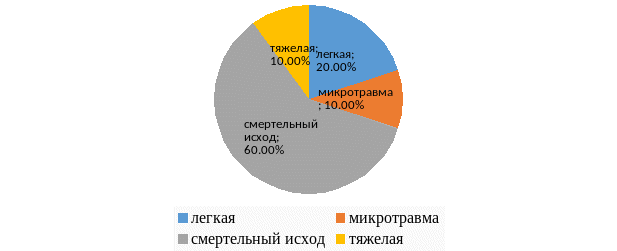 На основании анализа обстояте5льств травматизма по сети железных дорог РФ за период 2010-2014 гг составлена диаграмма процентного соотношения степени тяжести электротравм от наведенного напряжения. Отметим, что в 90% рассмотренных случаев персонал не использовал экранирующий защитный костюм.