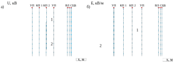 1 – Напряженность и напряжение в точке M на высоте 7 м; 2 – Напряженность и напряжение в точке M на высоте 1,8 м.