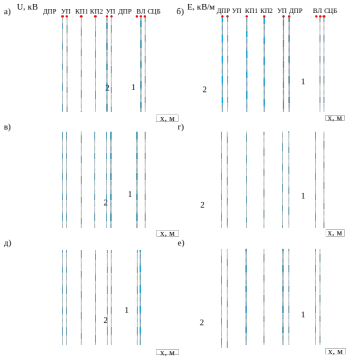 (справа). а,б – пятый провод отключен; в,г – шестой провод отключен, д,е – седьмой провод отключен. 1 – Напряженность и напряжение в точке M на высоте 7 м; 2 – Напряженность и напряжение в точке M на высоте 1,8 м.