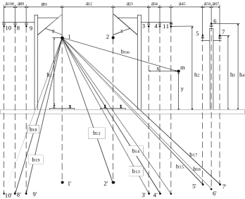 Значения высоты подвеса и радиуса эквивалентного провода аналогичны значениям рассчитанным в пункте 3.1. Расчетная схема представлена на рисунке 3.15. Для системы из 11 проводов уравнения Максвелла запишутся в виде: