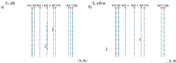1 – Напряженность и напряжение в точке M на высоте 7 м; 2 – Напряженность и напряжение в точке M на высоте 1,8 м.