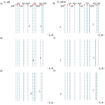 (справа). а,б – пятый провод отключен; в,г – шестой провод отключен, д,е – седьмой провод отключен. 1 – Напряженность и напряжение в точке M на высоте 7 м; 2 – Напряженность и напряжение в точке M на высоте 1,8 м.