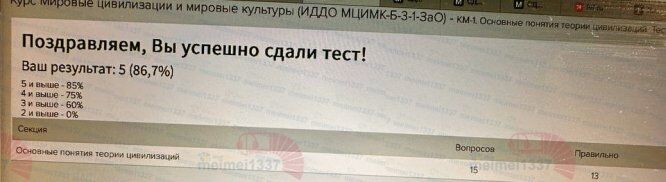 Для студентов ИДДО НИУ «МЭИ» по предмету Мировые цивилизации и мировые культурыКМ-1. Основные понятия теории цивилизиаций. Тестирование - 86,7%КМ-1. Основные понятия теории цивилизиаций. Тестирование - 86,7%