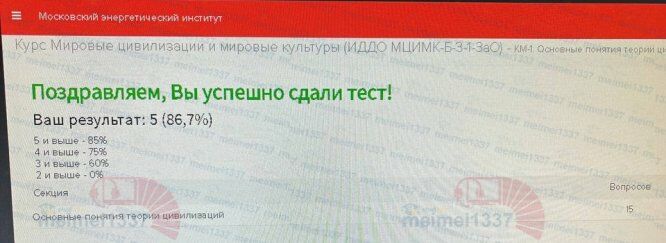 Для студентов ИДДО НИУ «МЭИ» по предмету Мировые цивилизации и мировые культурыКМ-1. Основные понятия теории цивилизиаций. Тестирование - 86,7%КМ-1. Основные понятия теории цивилизиаций. Тестирование - 86,7%