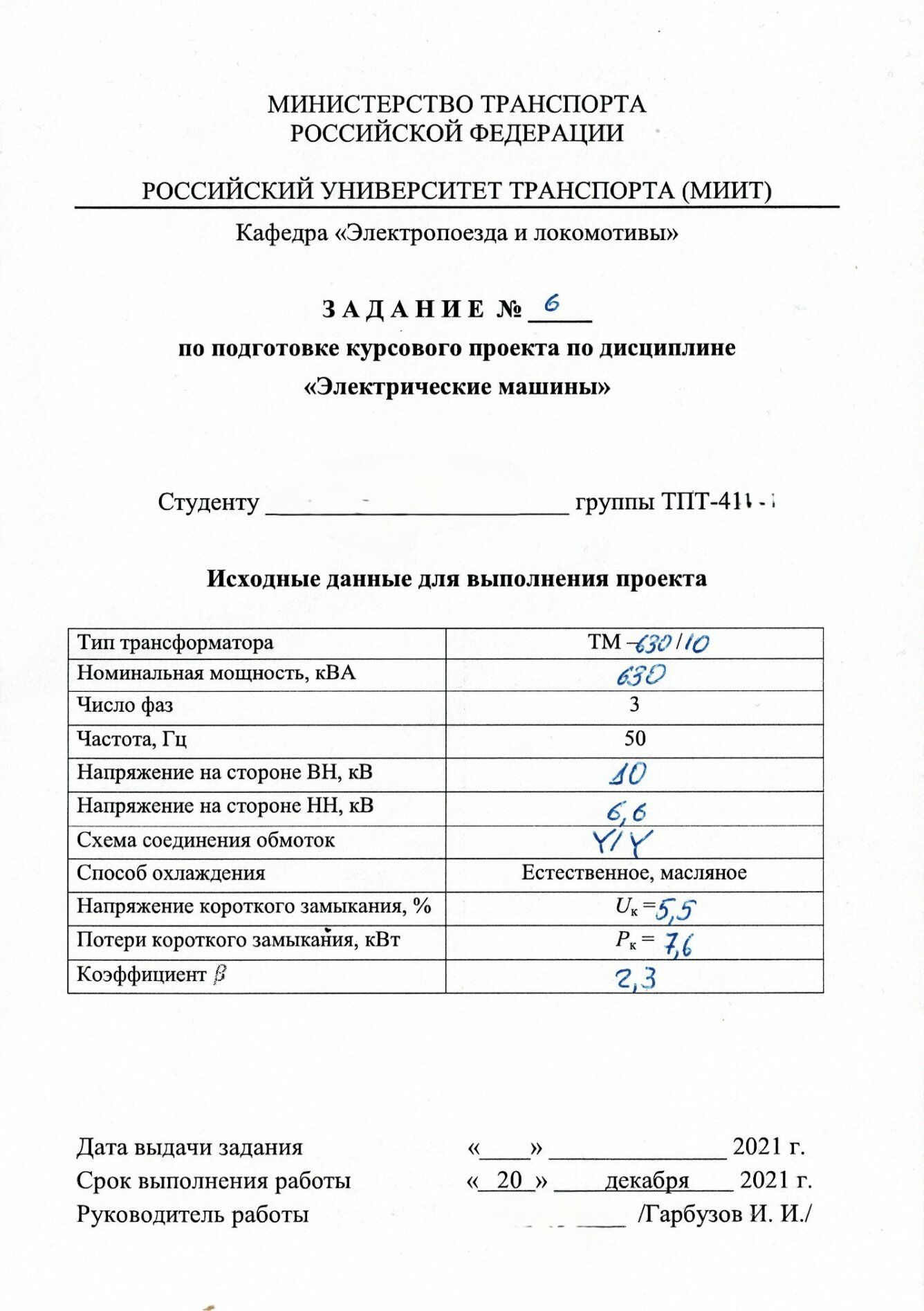 Электрические машины Расчёт силового трансформатора РУТ (МИИТ) Тип: ТМ- 630/10; 630кВА, фаз 3; 50Гц; ВН 10; НН 6.6; Схема Y/Y; Uк = 5,5, Pк = 7.6, Коэф 2.3