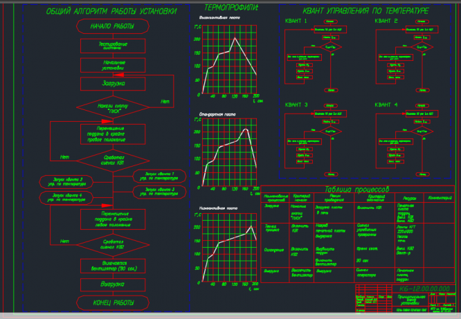 Курсовой проект выполнен в объеме 4-х листов А3 и расчетно-пояснительной записки. На первом листе приведены автоматный граф работы установки и таблица процессов. На втором и третьем листах - комплексная принципиальная схема установки - механика, энергообеспечение, системы автоматического и ручного управления. На четвертом листе – электрическая схема управления. В расчетно-пояснительной записке приведены необходимые пояснения и расчеты, отражены принципы построения СУ установки, даны описания листов проекта.