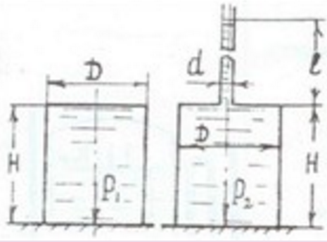 Стальная бочка диаметром D=0,6м, высотой h=0,9м заполнена водой. Определите:n1)cилу манометрического давления Р1 на дно бочки, силу G1, передаваемую на пол, если масса пустой бочки равна 35кг; 2)cилу манометрического давления Р2 на дно бочки, если в крышке просверлить отверстие и к нему приварить вертикальную трубку диаметром d=2см, длиной h1=15м, которую заполнить водой (рис. 5);n3)силу G2, передаваемую на пол во втором случае, пренебрегая весом трубки;n4)силу манометрического давления Р3 на верхнюю крышку; 5)что воспринимает силу давления, равную разности между силой манометрического давления на дно Р2и силой веса жидкости в бочке? ![]()